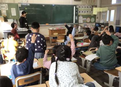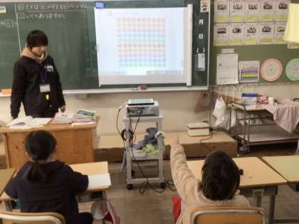 授業の始めに「76は10が( )つと1が( )つ」という復習問題を数問やり、「いくつあるかな」の学習に入ります。プロジェクターで映し出された葉っぱの数を求める方法を既習内容を活用して考えていきます。