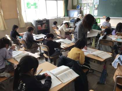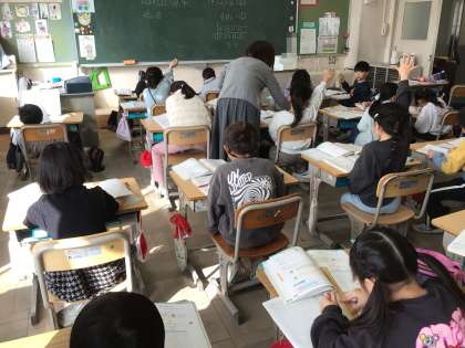 九九にないかけ算を考えています。九九の数字の増え方の決まりを使って、12×3などのかけ算の解き方を考えました。計算ができた児童は挙手をして、先生に答え合わせをしてもらっています。