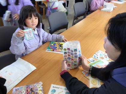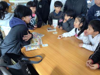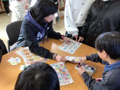 図書館まつりに来た児童のために、ALTの先生が英会話コーナーで児童と英語を交えてふれ合っています。図書室に来る楽しみが増えています。