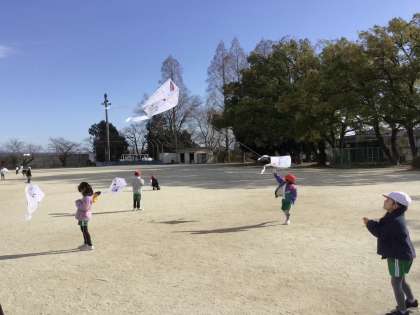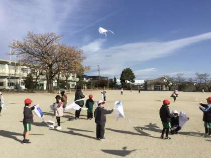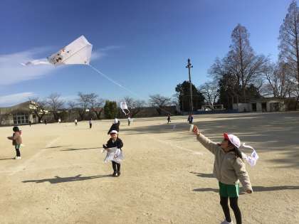 自分のお気に入りの絵を描いた凧をとばしています。高く上がると、児童たちの嬉しそうな笑顔が見られました。凧あげも昔から続いている遊びです。
