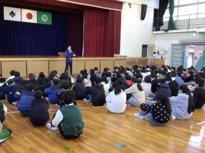 学年集会で、今後の学年の活動について話をしています。もうすぐ卒業を迎える6年生のためにできることや6年生から最高学年を引き継ぐための心構えなどを児童たちは真剣に聞いていました。