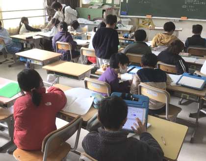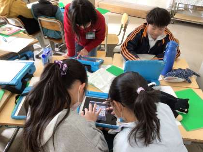 今まで探究してきた「食」についての発表会の準備をしています。学習用タブレットや画用紙を使って、見出しや文、図、写真などのレイアウトを工夫して分かりやすい発表になるようにグループで考えています。