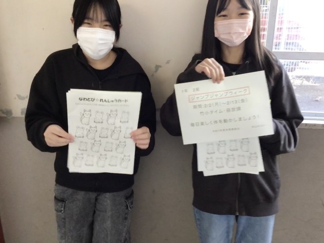 体育委員会の企画で2月から2週間、「ジャンプ・ジャンプウィーク」(なわとび強調週間)が始まります。写真は、6年生の体育委員が1年生の教室を訪問し、説明をしている様子です。竹小タイムや昼休みの運動場がジャンプ・ジャンプウィークの会場となります。体育委員のみなさん、体力・運動技能の向上のための企画をありがとうございます。