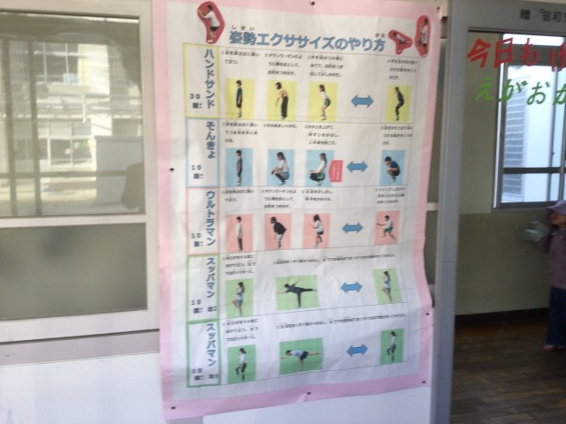 保健委員会が企画した朝の姿勢エクササイズです。継続することで、体幹も鍛えられエクササイズもスムーズに行えるようになってきました。