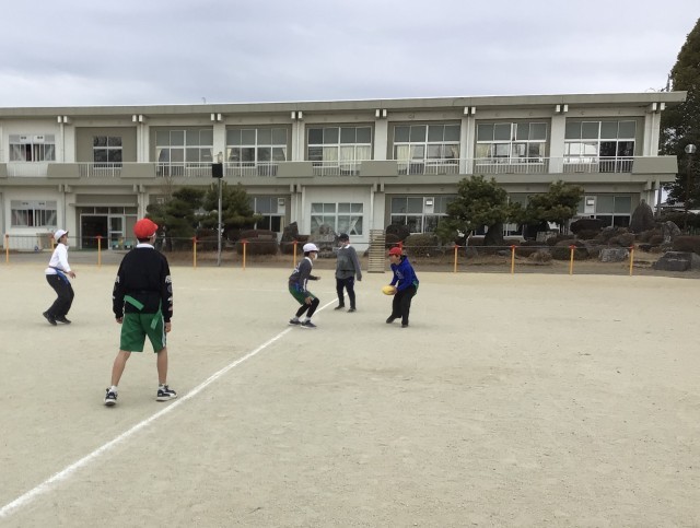 フラッグフットボールの授業です。フットボールを使ったゴール型スポーツで、「戦略×運動×協力」が絶妙に混ざったスポーツと言われています。走る・止まる・方向転換するなど、全身を使う動きが多いのも特徴です。