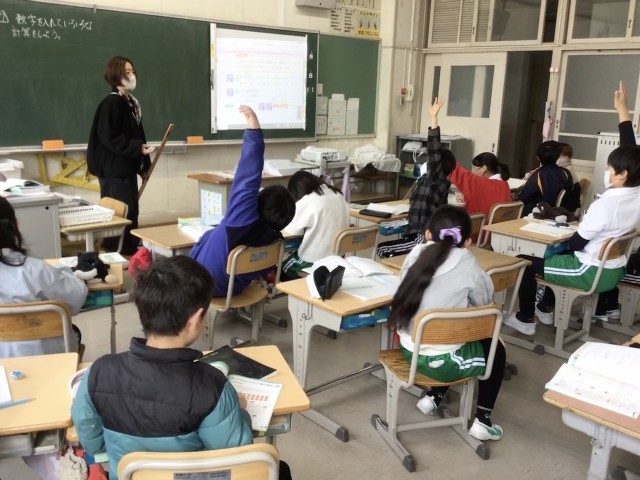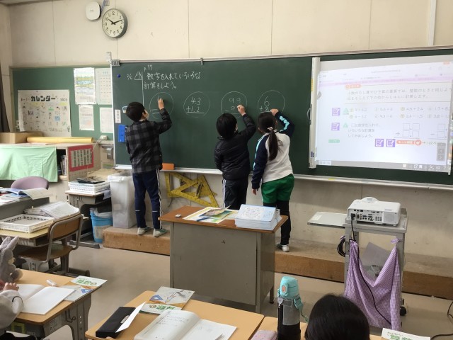 小数のひっ算の復習です。自分たちで問題を作り、みんなで解きました。小数点をそろえて数字をかくことが、小数のひっ算のポイントです。