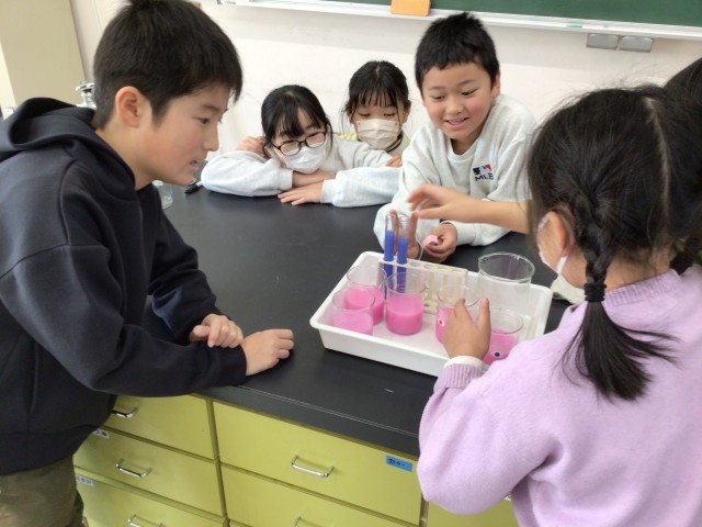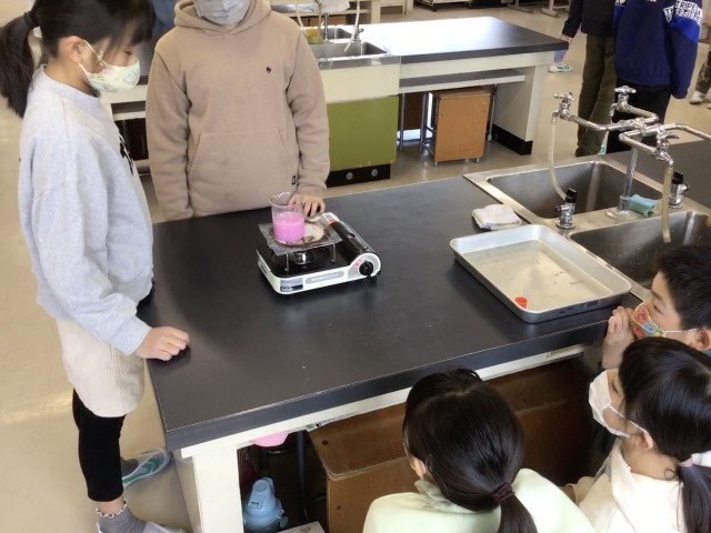 水の温まり方を実験で確認しました。温度で色が変わる液体を使って、色の変化の仕方から温まり方を考察しました。