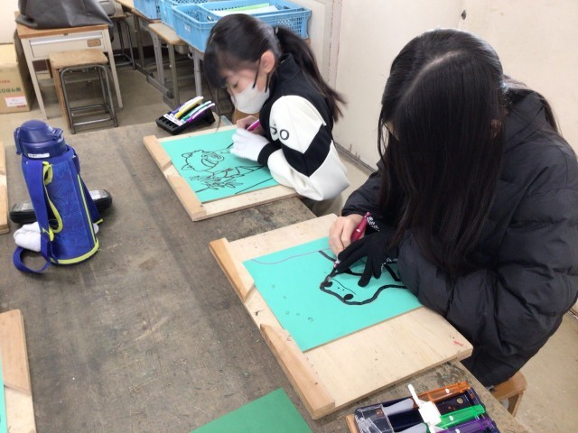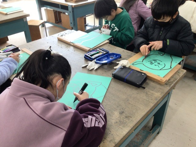 彩色版画の作品作りです。動物の輪郭の版元を彫っています。どんな作品が完成するか、楽しみです。