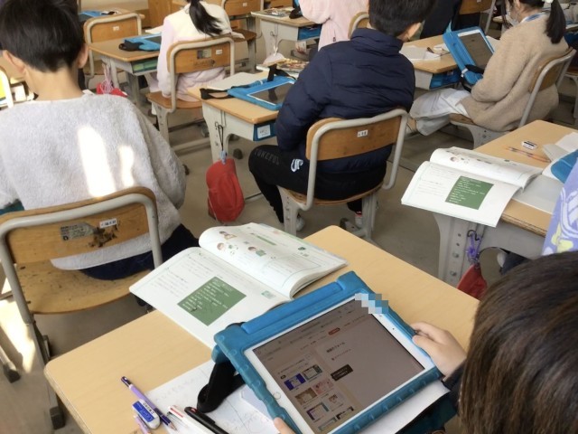アンケートで調べたことを報告する学習です。学習用タブレットのアプリでアンケートを作っています。調べたいことを考えながら、どういう質問をすればよいかを話し合い、どんな結果になるかも予想していきます。