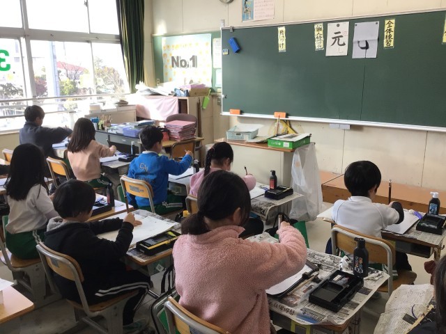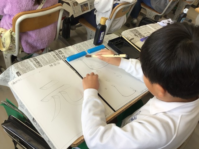 元気の「元」の字を筆使いに気を付けて、「曲がり」を意識して練習していきます。最初は墨汁をつけずに、なぞり書きで筆使いを確かめています。
