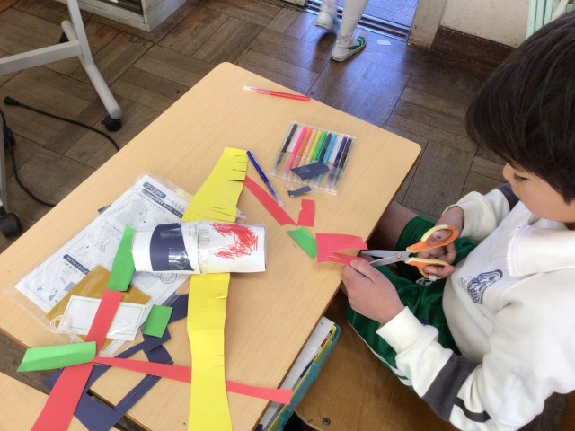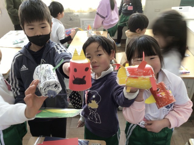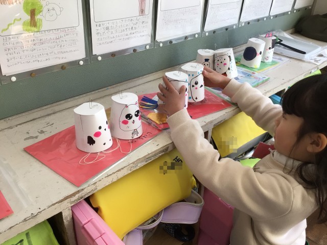 糸をつたって移動する「スルスル ビューン」の作品作りです。完成したのがうれしくて、作品を見せてくれた児童もいました。動物や乗り物が、スルスル ビューンします。