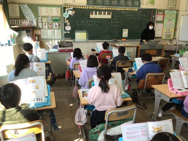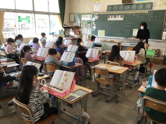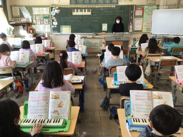 先生のオルガンの音に合わせて、「ドレミファ ソソ ・・・」と鍵盤ハーモニカで演奏をしています。指の動きが難しい部分は、滑らかに弾けるように繰り返し練習していました。
