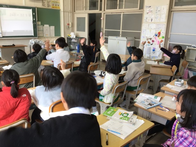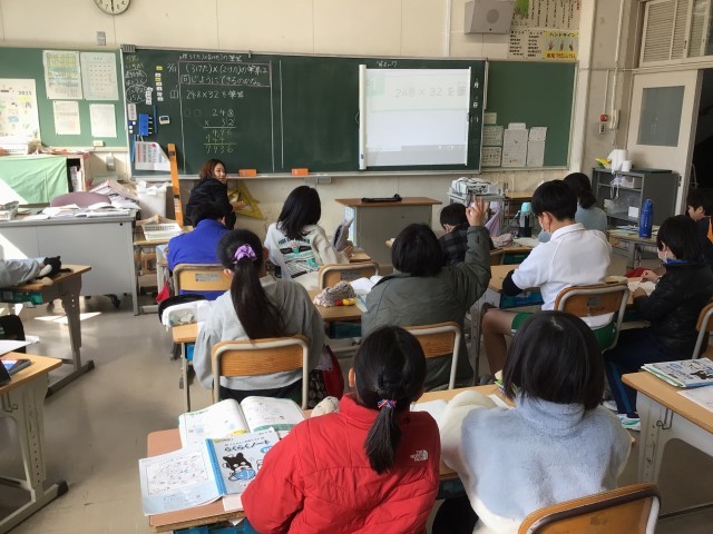 3けた×2けたのひっ算の学習です。繰り上がりの数をどうすればよいかを考えていました。授業の最後には、学習のまとめをノートに書いています。