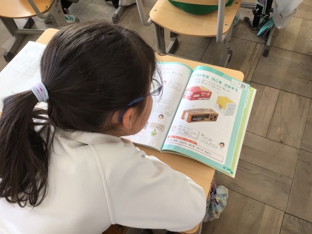 箱の形を見て、気づいたことを考えています。写真下は、いくつの四角形でできているかを実物の箱で確認しているようすです。