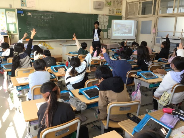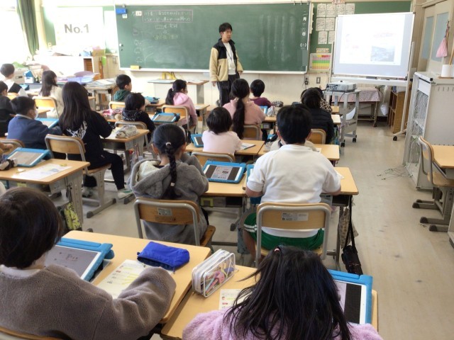 119番に電話をかけるとどこにつながるかをもとに、消防署の役割を考えています。学習用タブレットのデジタル副読本の写真を拡大して、どんな物があるかを発表しています。