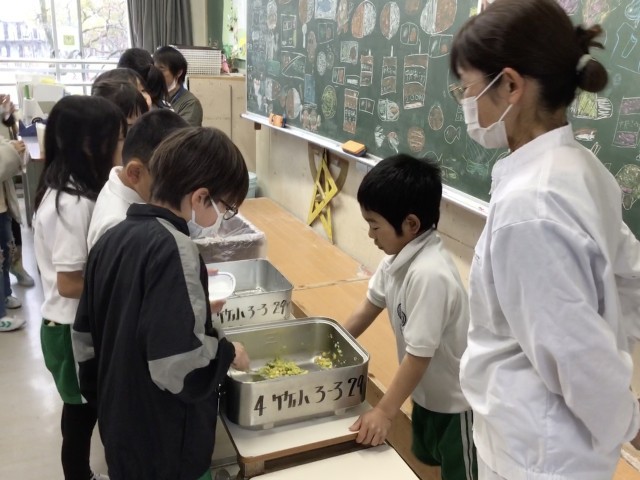 総合的な学習の時間に「食」をテーマに探究活動を行ってきた3年生が、給食センターの職員の方と栄養教諭をお招きして、感謝の会を行いました。給食を作る道具を見せていただいたり、一緒に給食を食べたりしました。給食後に、各クラスから感謝のメッセージを贈りました。給食センターの職員の皆様、おいしくて栄養満点の給食をいつもありがとうございます。