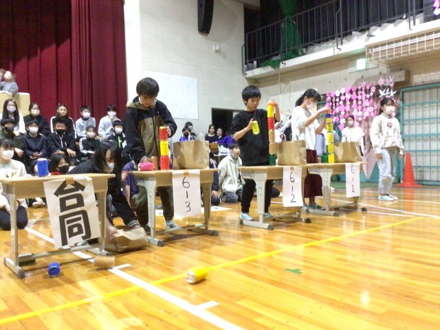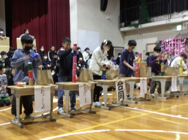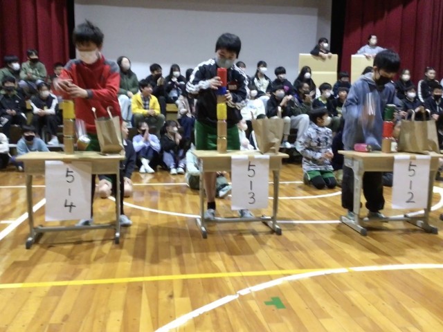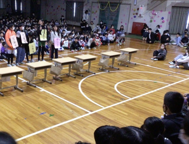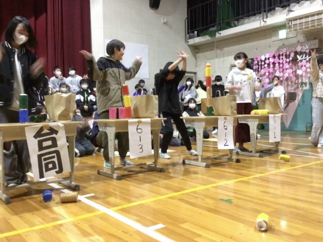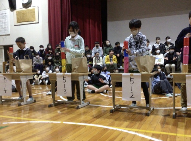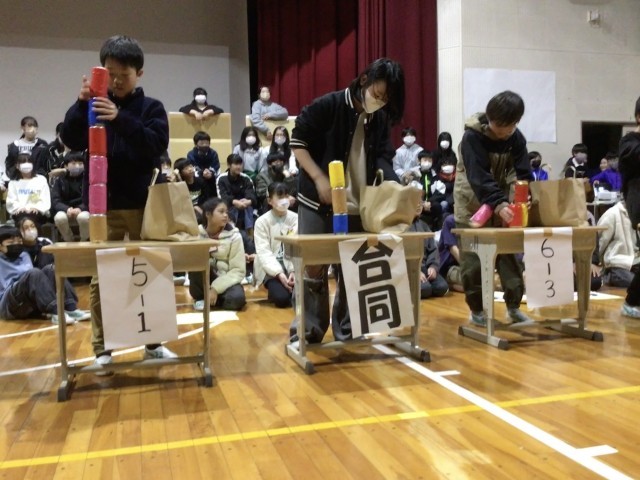 5年生は、「あるミカン対決」を行いました。缶を積み上げ、倒さずにミカンを乗せるルールです。対決後に、6年生への感謝のメッセージが贈られました。