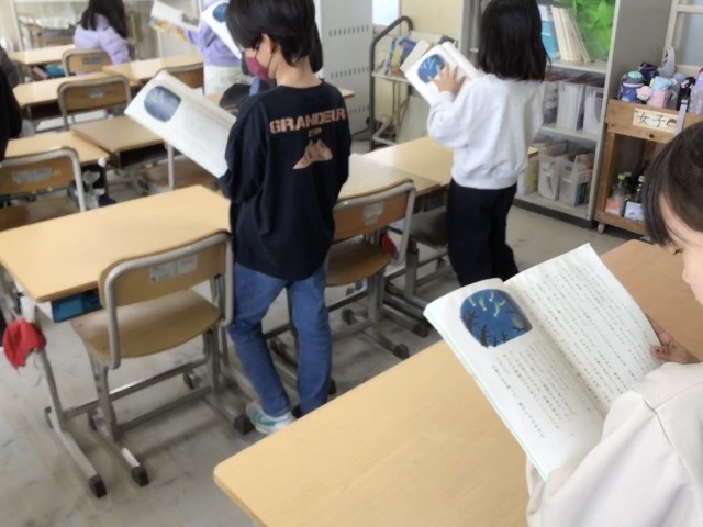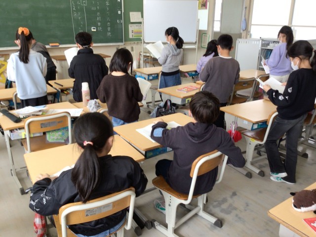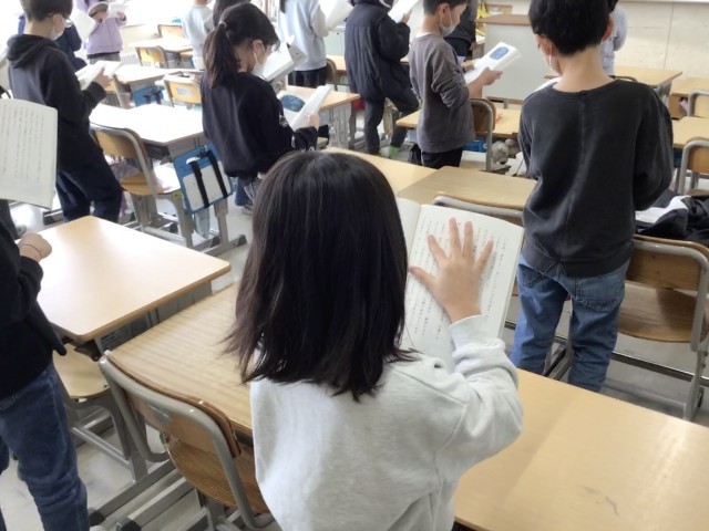 グループで「。」読みして、物語に親しむ授業です。どこで、自分の順番がきてもすらすら読めるように、練習をしています。