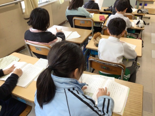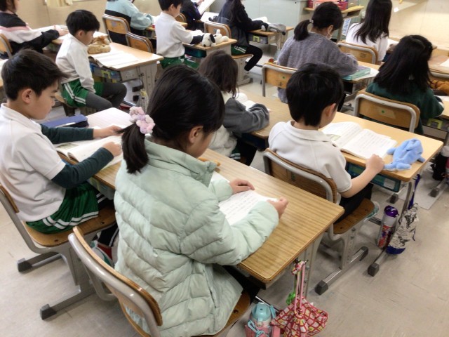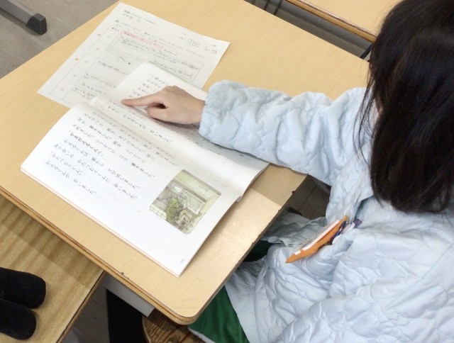 お話を5つの場面にわけ、登場する「がまくん」と「かえるくん」が何をしていたかを整理していきます。写真は、物語の内容を確認するために、順番に教科書を読んでいる様子です。