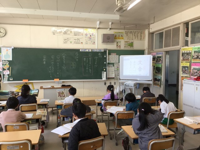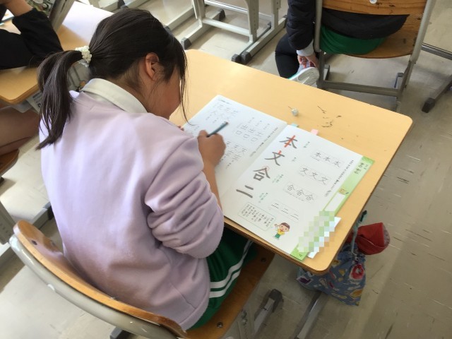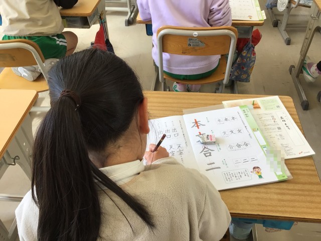 「字の中心に気を付けて ていねいに書こう」をめあてに、書写の練習をしています。児童たちは、お手本を見ながら集中して練習していました。