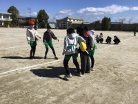 Tボールの授業です。攻撃と守備に分かれて、練習をしています。「ナイスバッティング」「ナイスキャッチ」など、声を掛け合いながらプレーをしています。