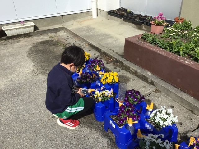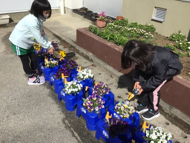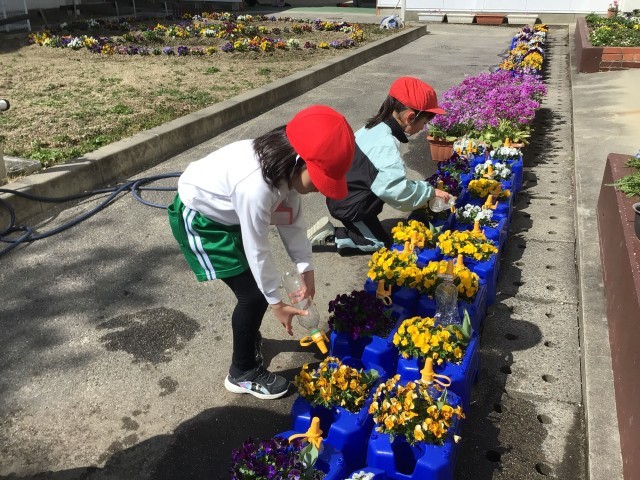 1人1鉢で、ビオラとチューリップを育てています。卒業式の会場を1先生が育てた花で飾ります。暖かくなってきて、鉢植えの花も大きくなってきています。