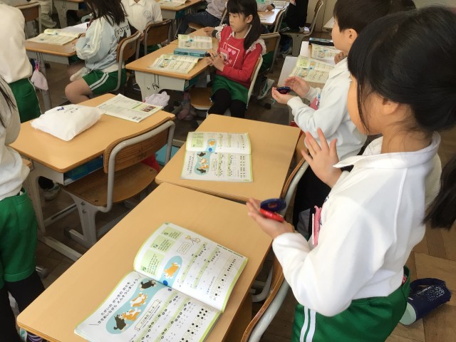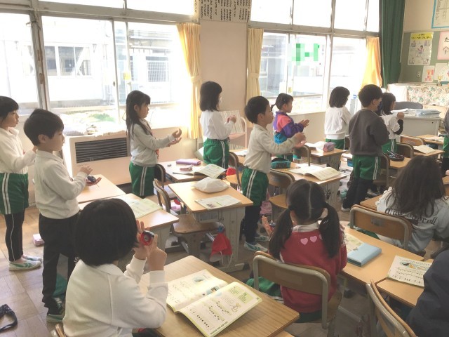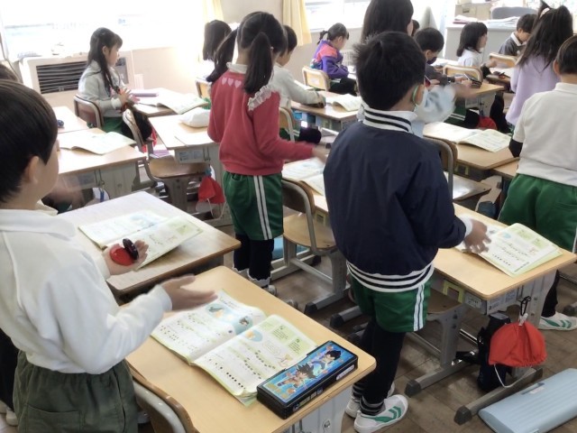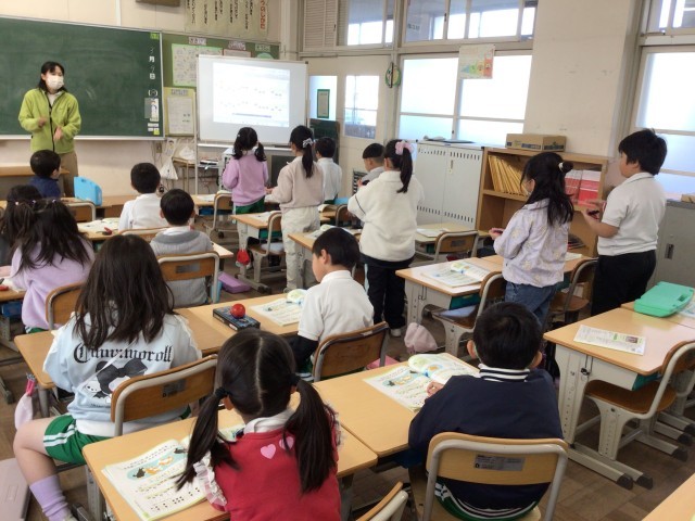 「たがいの がっきの おとを ききあいながら えんそうしましょう」をめあてに、カスタネットと歌のグループに分かれて練習しています。グループを順に変えながら、どの児童もカスタネットでリズム伴奏ができるようにしています。