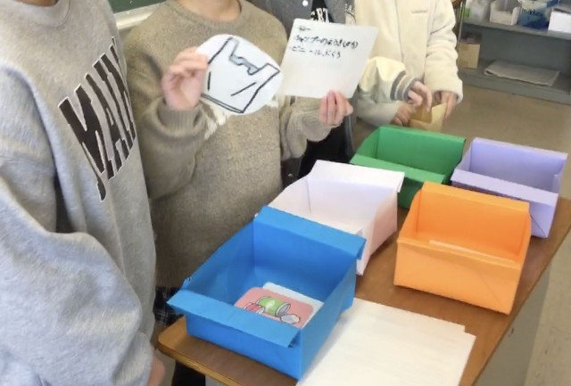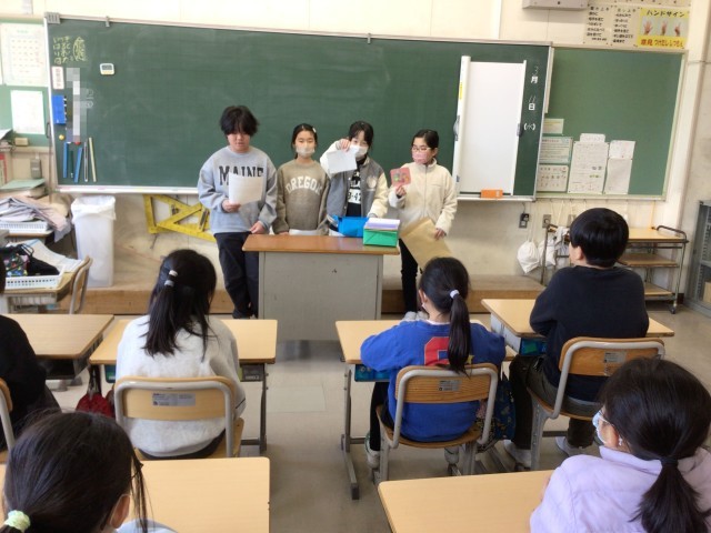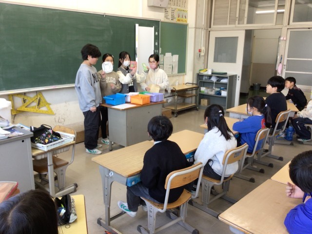 4年生が総合的な学習の時間に探究した「地球を守ろう大作戦」の取組を3年生にも知ってもらうために、異学年で交流しています。写真は、ごみの分別カードを作ったグループが、3年生にも使ってもらおうと説明している様子です。