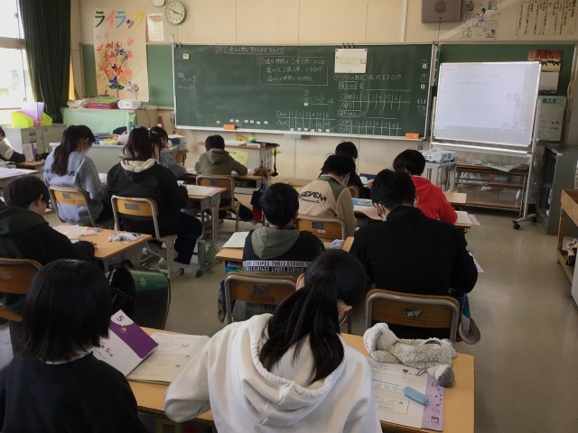 表を作って数字の変化のようすから、比例の関係を考える学習しています。問題が解けた児童はワークの問題に取り組み、個別の学習の時間としていました。
