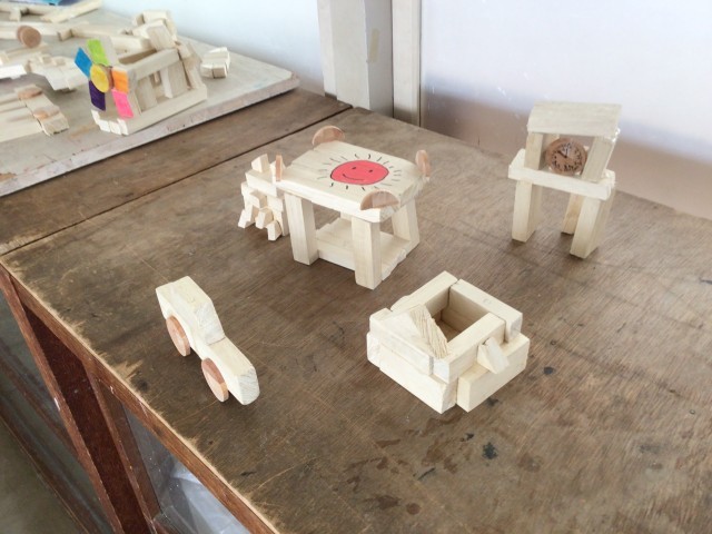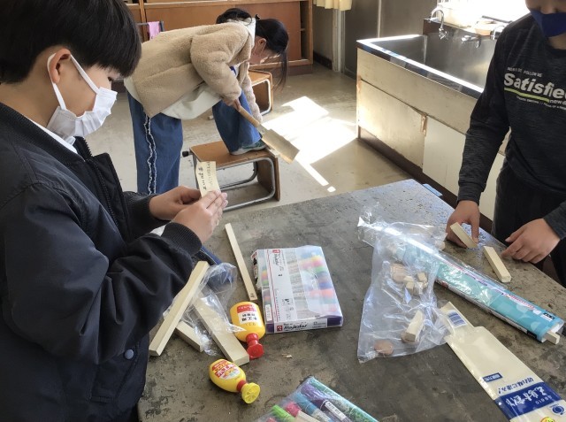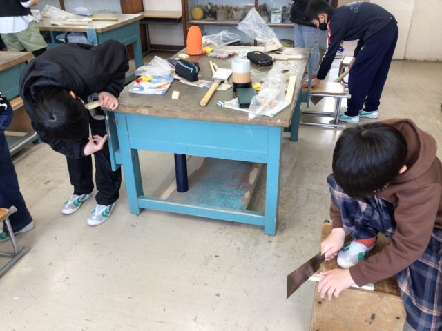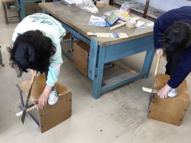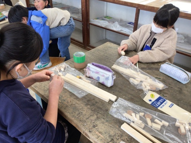 「のこぎり ギコギコ」の作品作りです。板をのこぎりで切った後、やすりをかけて切り口を滑らかにして、作品を組み立てていきます。児童たちは自分の手を切らないように気を付けて、板を垂直に切ったり、斜めに切ったりしていました。