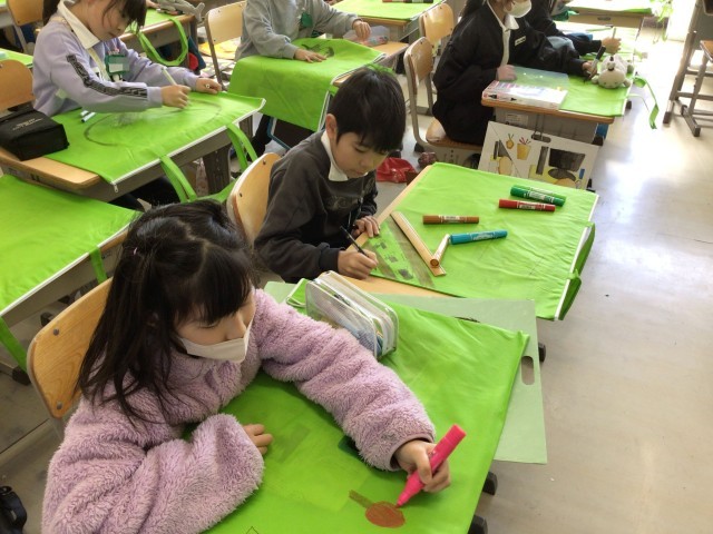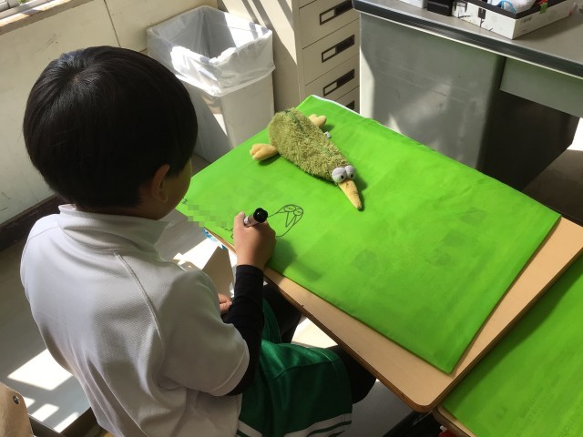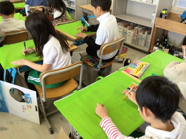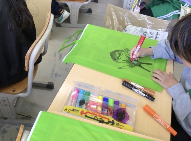 作品バッグにお気に入りの絵を描いています。担任の先生を書いている児童もいました。作品とともに3年生の思い出もたくさん詰めて、持ち帰ります。