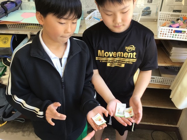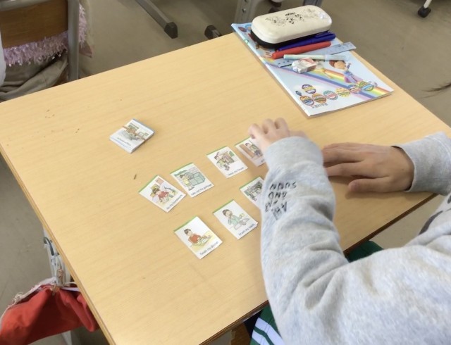 「This is my day.」の学習です。日常生活が書かれたカードを使って、何時に何をしているかを英語で会話をしています。絵カードには、学校へ出かける場面や食事の場面、起床や就寝などの生活の場面が書かれていました。児童たちは、カードを見せながら「I ~ at ~.」と英会話を練習していました。