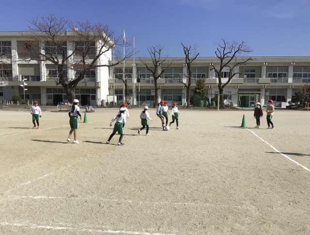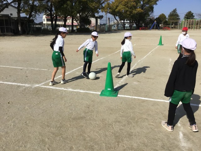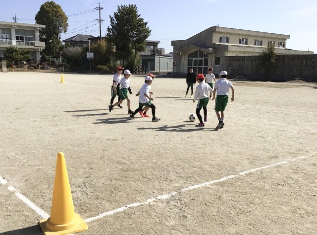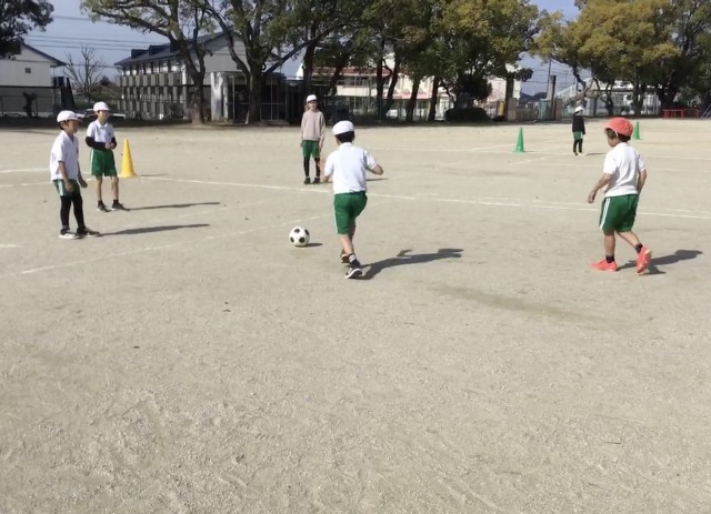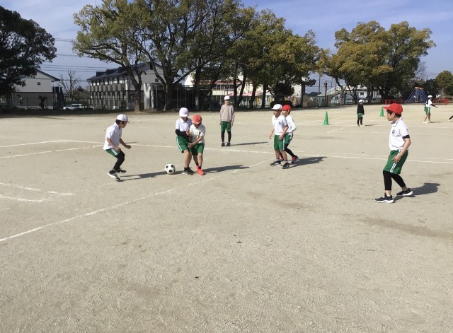 ボール運動で、サッカーのパス回しの練習をしています。みんながボールに集まるのではなく、コート内で広がってパスを出せる場所を作るように練習しました。