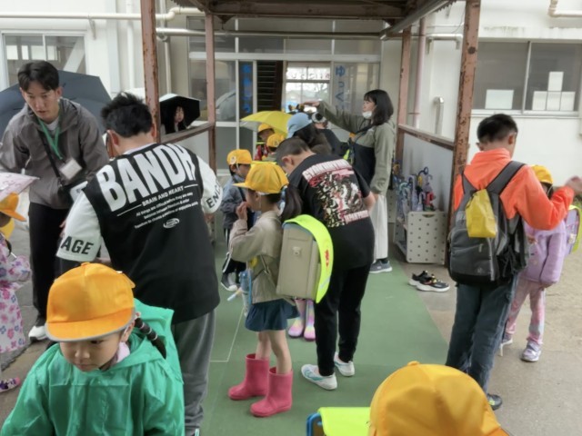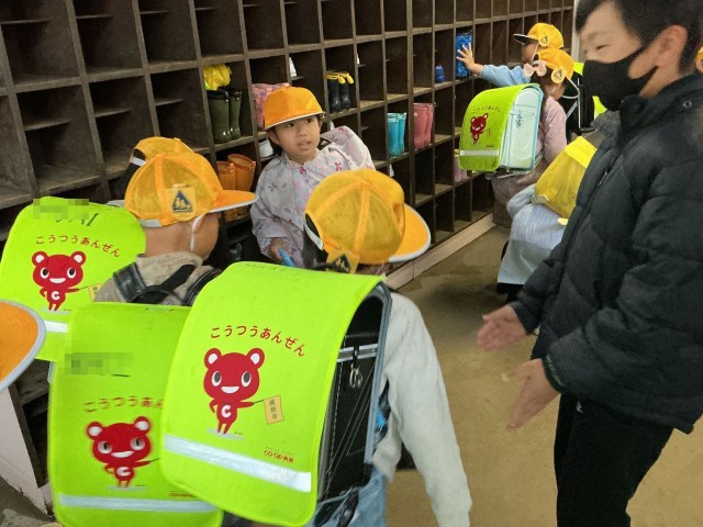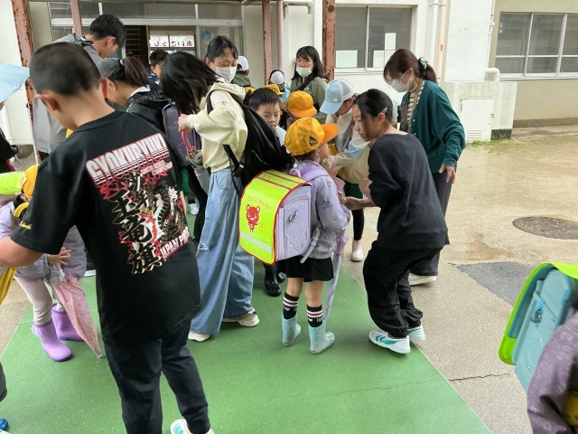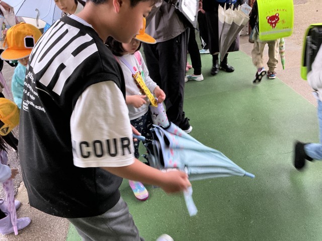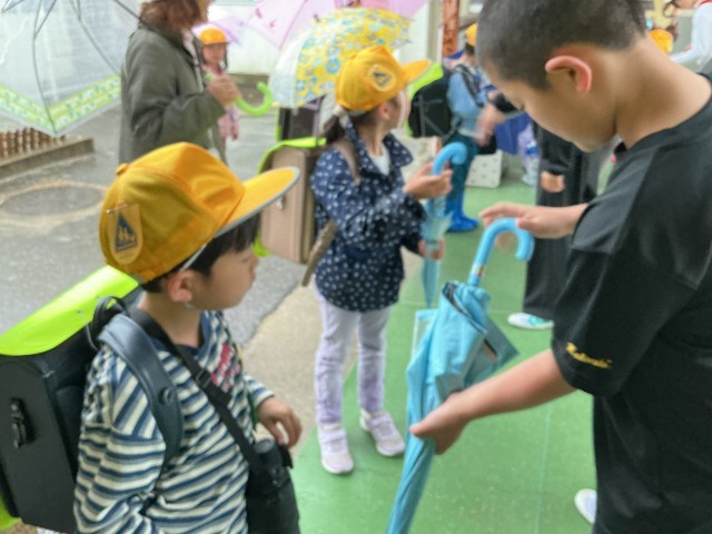 雨の日の朝、通学団のお世話係の児童が1年生の昇降口で助けてくれています。お世話係のみなさん、1年生のためにありがとうございます。