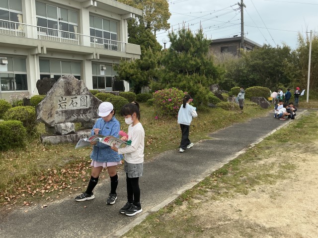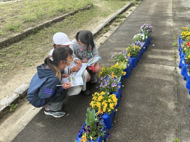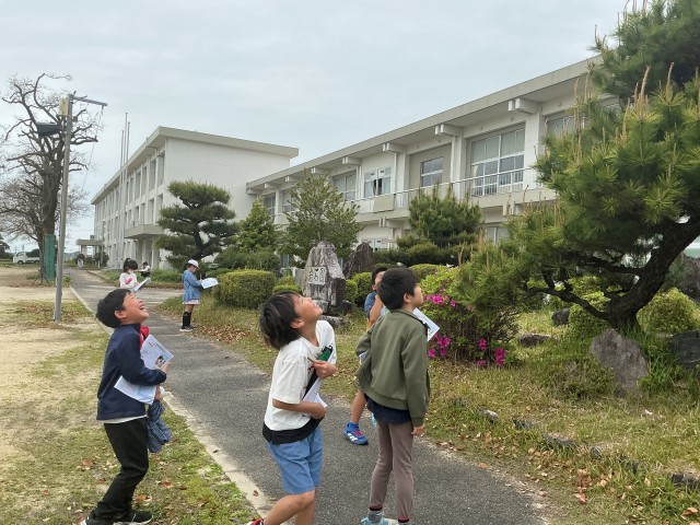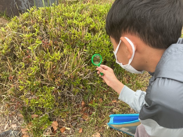 春の生物を探しています。飛んでいったテントウムシの行方を追ったり、虫メガネで小さな生物を見つけたりしている児童もいました。見つけた生物はワークブックに記録しました。