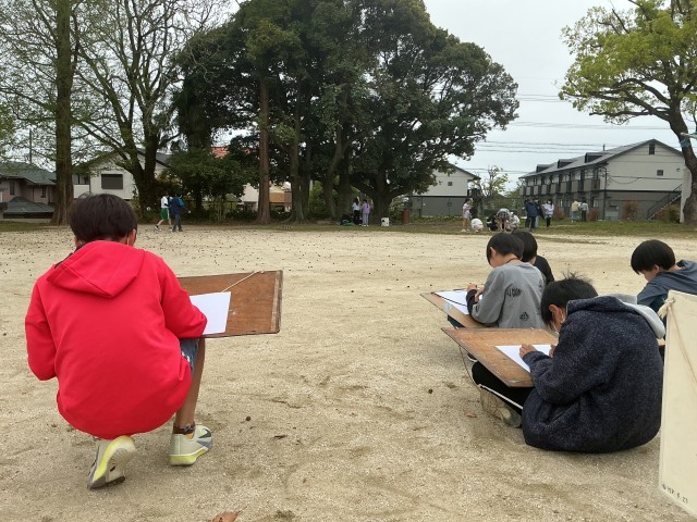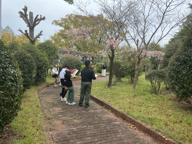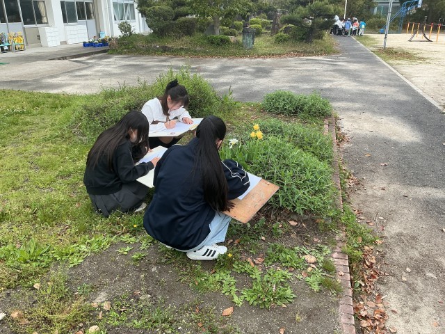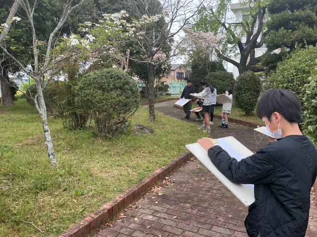 春の風景をスケッチしています。花や新緑の樹木など、自分が見つけた春を風景画にします。