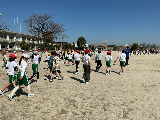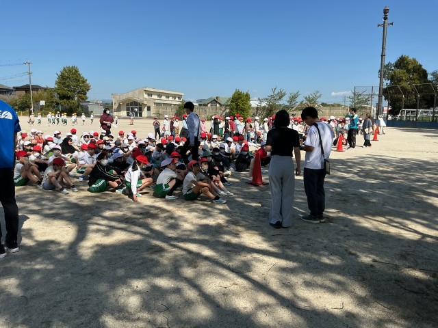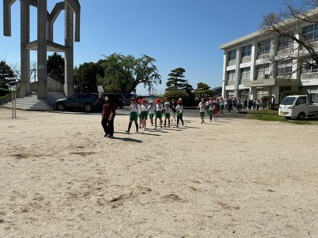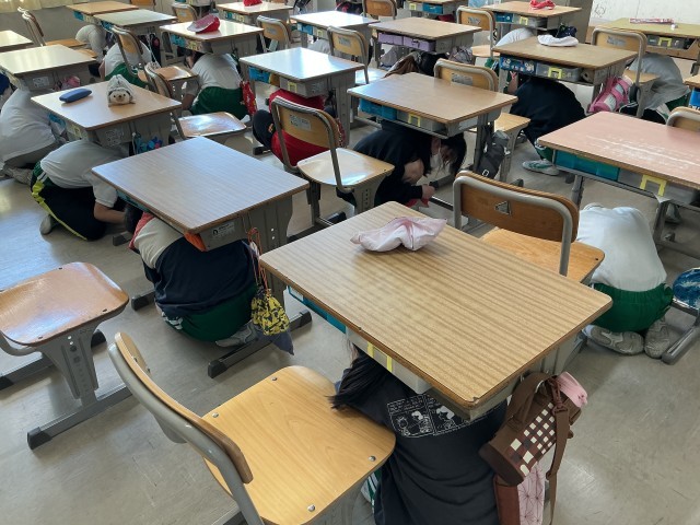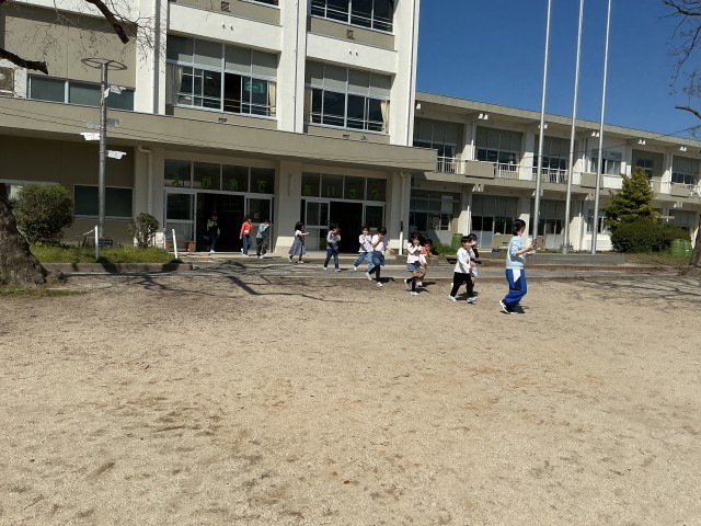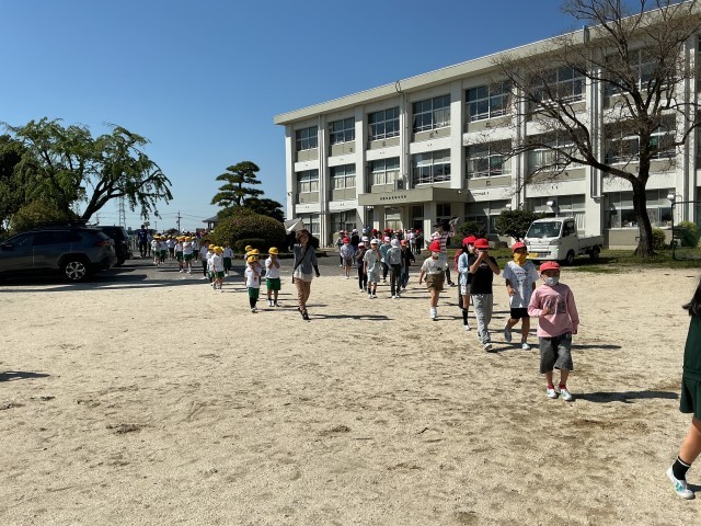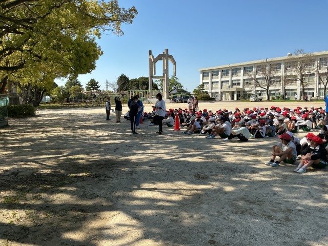 地震が起きたときのシェイクアウト(姿勢を低くして頭を守る)と運動場までの避難経路を確認しました。お・は・し・も(おさない、はしらない、しゃべらない、もどらない)を守って、真剣に訓練を行いました。避難訓練は、今回も含めて年3回を計画しています。