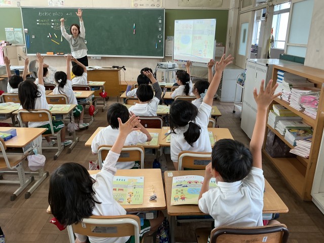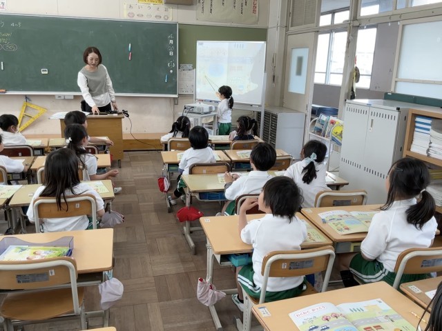 教科書の「わくわく がっこう」のページにかかれている絵を見て、何がいくつあるかを見つけています。ホワイトボードに拡大した教科書を映して、発表する児童の答えが他の児童にも伝わりやすいようにしています。
