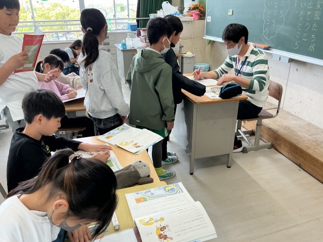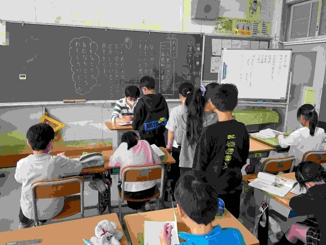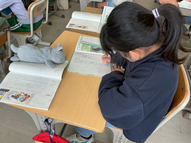 「一人音読をして、一言感想を書こう」の授業です。一言感想といっても、「楽しかった」「おもしろかった」という一言ではなく、好きなところや気になるところ、おもしろいところを具体的に膨らませて書き、担任の先生に見てもらっていました。