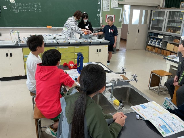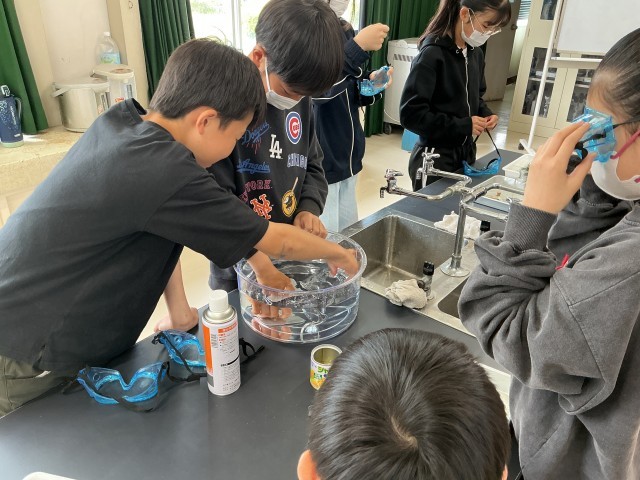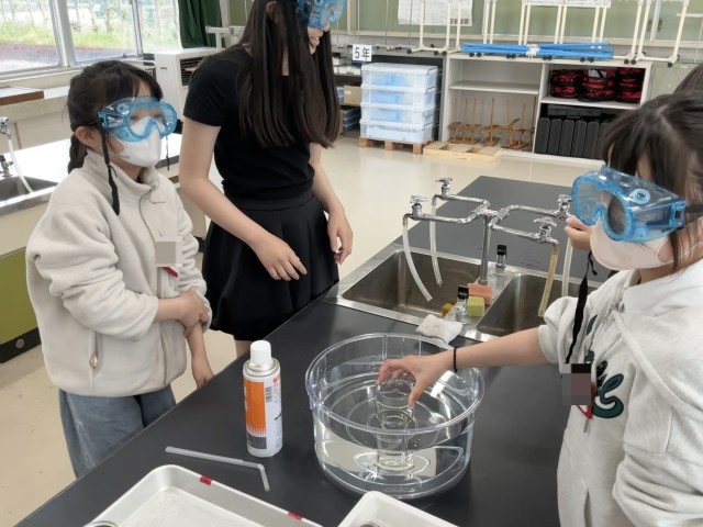 気体の性質を調べる実験です。3種類の気体を集気びんに集め、燃える性質があるかどうかを調べました。予想通りの結果になったでしょうか。