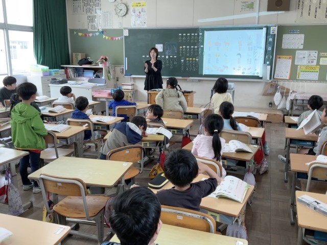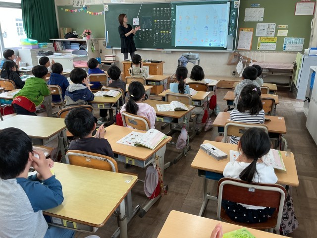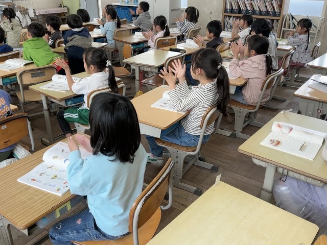 「あいうえおの ことばを あつめよう」の学習です。「あ」や「い」で始まる2~5文字のことばを発表し合いました。授業の後半では、みんなが集めたことばを文字数に合わせて手をたたきながら、読みました。