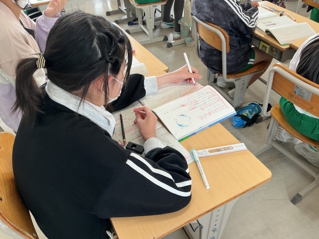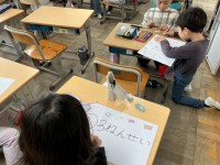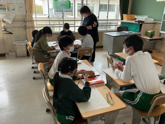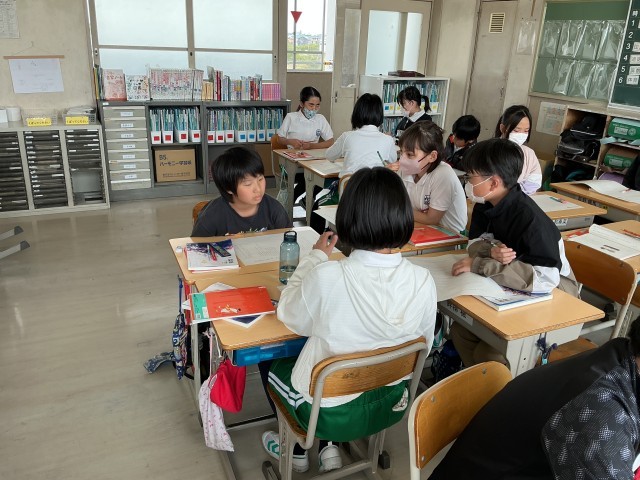 物語を読解し、登場人物の気持ちになって朗読の仕方を考えています。写真は、グループで、だれがどの部分を読むかを決めている様子です。
