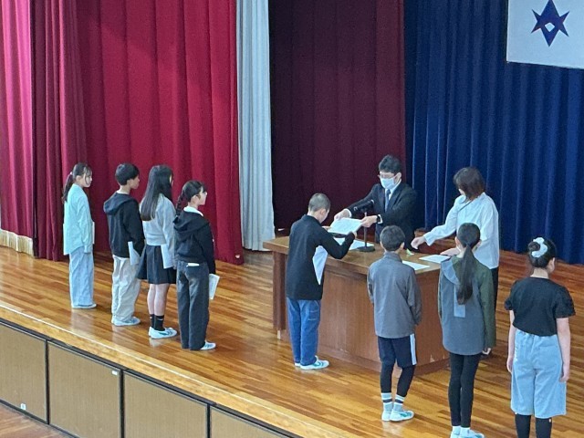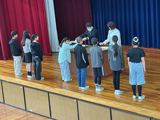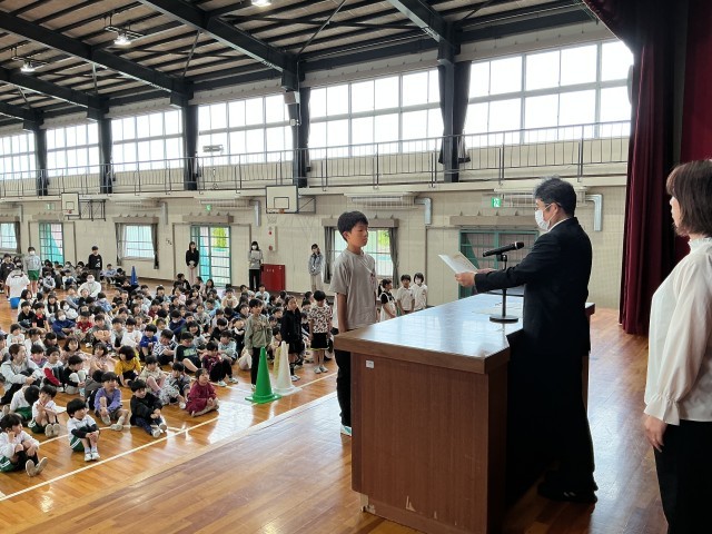 続いて、委員長と学級委員の任命を行いました。学校や学級をよりよくするためにがんばります。他の児童にはサポーターとして、任命の言葉を贈りました。