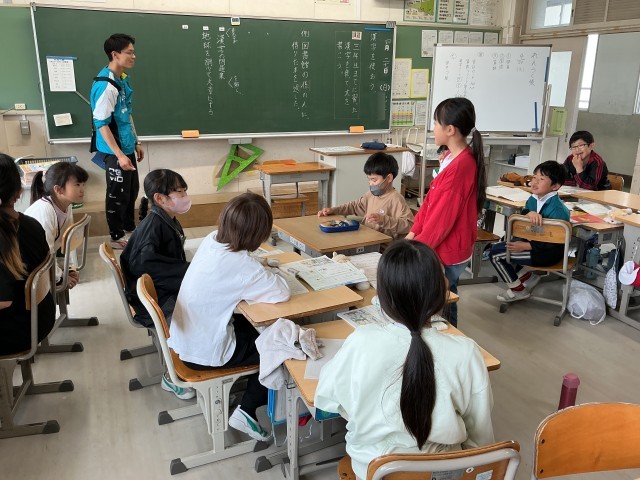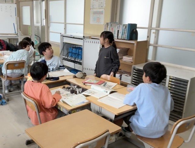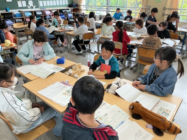 教科書の絵の中の四角の言葉を使って、文を考えています。考えた文をグループで発表し合い、その後、学級全体に広めました。習った漢字を使って文を書くという学習のめあても意識して、たくさんの文を作っていました。