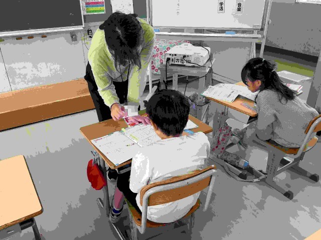 「九九の表とかけ算」の学習です。九九の表にのっていないかけ算も九九の答えの増え方のきまりから、答えを考えています。児童が問題を解いている間に、担任は児童の質問に個別に答えています。