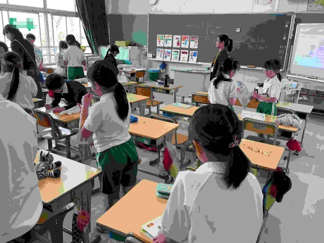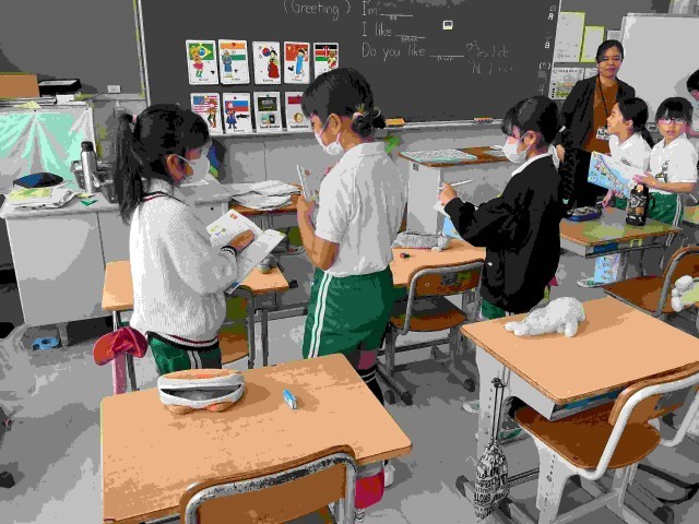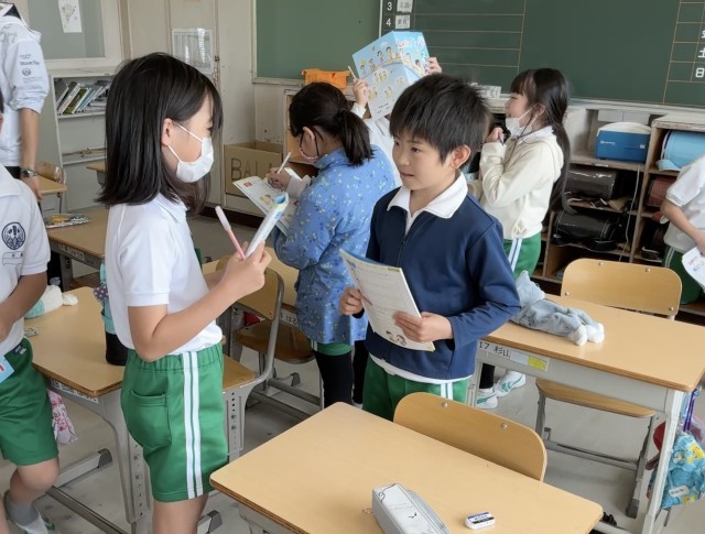 ペアで英会話を学んでいます。課題は、「あいさつをして、友だちのすきなものをたずねよう」です。どういう答えが返ってきたかを聞き取り、ワークにメモしています。ペアをかえながら、多くの友だちと会話をしました。ALTの先生や担任の先生と会話している児童もいました。