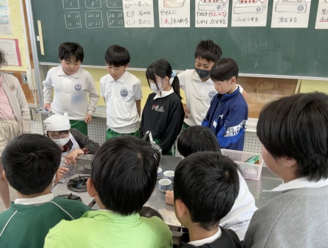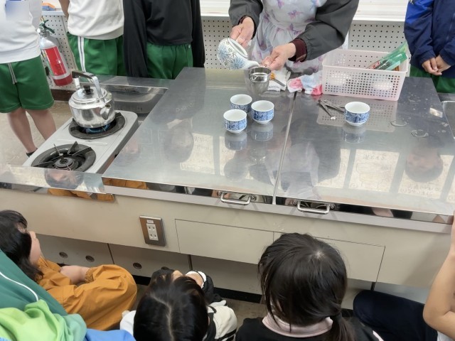 調理実習の始めは、おいしいお茶の入れ方を学びました。ガスコンロの使い方や茶こしの使い方の演示を見た後、自分たちでお茶を入れました。