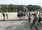 台風一過の朝、通学団で児童たちが登校してきました。 門では生活委員の児童が、...