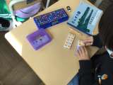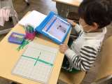 「かたちづくり」の学習です。算数セットの棒や色板で形をつくり、発表ノートに記録...
