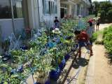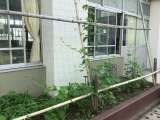4年生が育てているツルレイシです。つるが教室の1階分ほどに伸びて花をつけ始めま...
